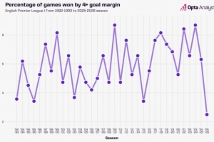 本赛季英超至今,只有2.5%的比赛以至少4个净胜球的优势获胜,这是该项赛事历史上的最低比例。阿森纳周六4-0大胜利兹联,这是本赛季第6场至少净胜4球的情况,而在2023-24赛季,这样的胜利出现了33次。
