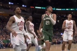 GIF-雄鹿不敌骑士,比赛中乌斯曼·吉昂在米切尔面前使用后者招牌海底捞大回环,结果脱手出界,米切尔看笑了!