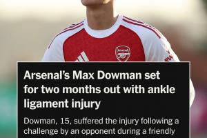 体育资讯12月10日讯 据TA记者奥恩斯坦消息,15岁阿森纳小将道曼脚踝韧带受伤,将伤缺2个月。