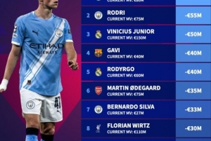 1、福登(曼城,8000万欧):-6000万欧