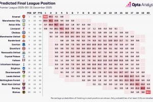 下一篇: 英超2025年度积分榜:阿森纳83分第一,曼城少赛2场80分排第二